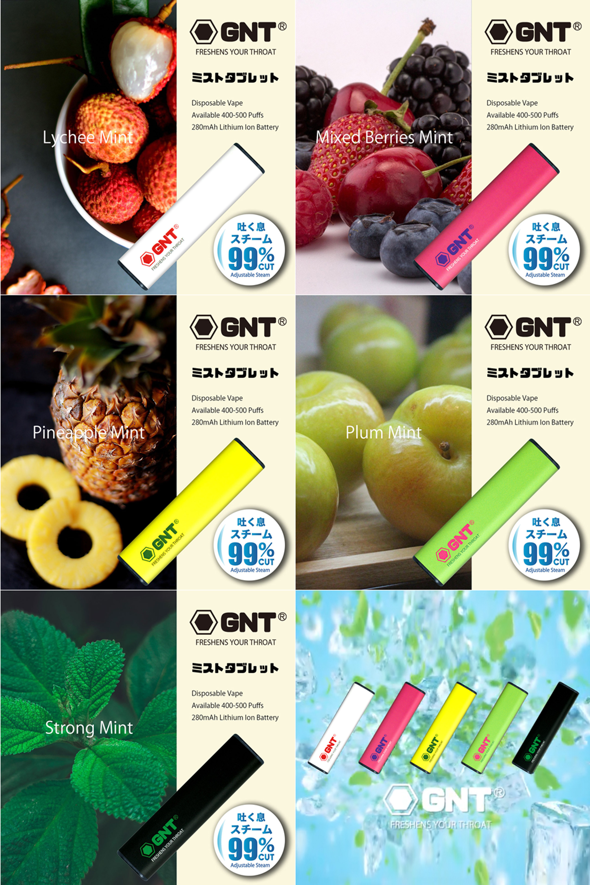 GNTは、清涼感を得ることを目的とした新感覚の電子清涼ミストです。現在、新ジャンルの商品として各国の市場から注目を集め、お問い合わせをいただいております。GNTは、ご自分のタイミングで1ブレスするだけ! 清涼菓子よりも即効性が高く、時間をかけずに「瞬間のど爽快!!」を体感させてくれます。また、吸い方によりスチームの量を調節できますので、周囲に不快感を与えることなく、さまざまなシーンでご使用いただけます。
